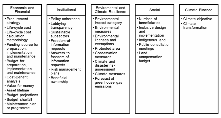The pilots included a data modelling exercise that used data points to collect information from a sample of infrastructure projects in each country. The data points included metrics such as life-cycle cost, value for money, and budget projections under the economic dimension; policy coherence, lobbying transparency, and beneficial ownership under the institutional dimension; environmental, conservation, and climate measures under the environmental and climate dimension; number of beneficiaries, public consultation meetings, and land compensation budget under the social dimension; and climate objective and climate transformation under the climate finance dimension. The data modelling was followed by an analysis of the insights generated to identify lessons for improving public infrastructure planning.