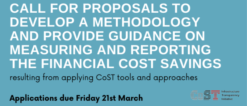 CoST, the Infrastructure Transparency Initiative, is working to improve the measurement and reporting of our macro-level impact. As part of that effort, we are seeking a consultant to develop a methodology and guidance, for use by CoST members and others, to measure and report on the financial cost savings resulting from applying CoST tools and approaches. This call for proposals describes the details of the assignment and invites applications from suitably qualified individuals or firms to be appointed to complete the assignment.